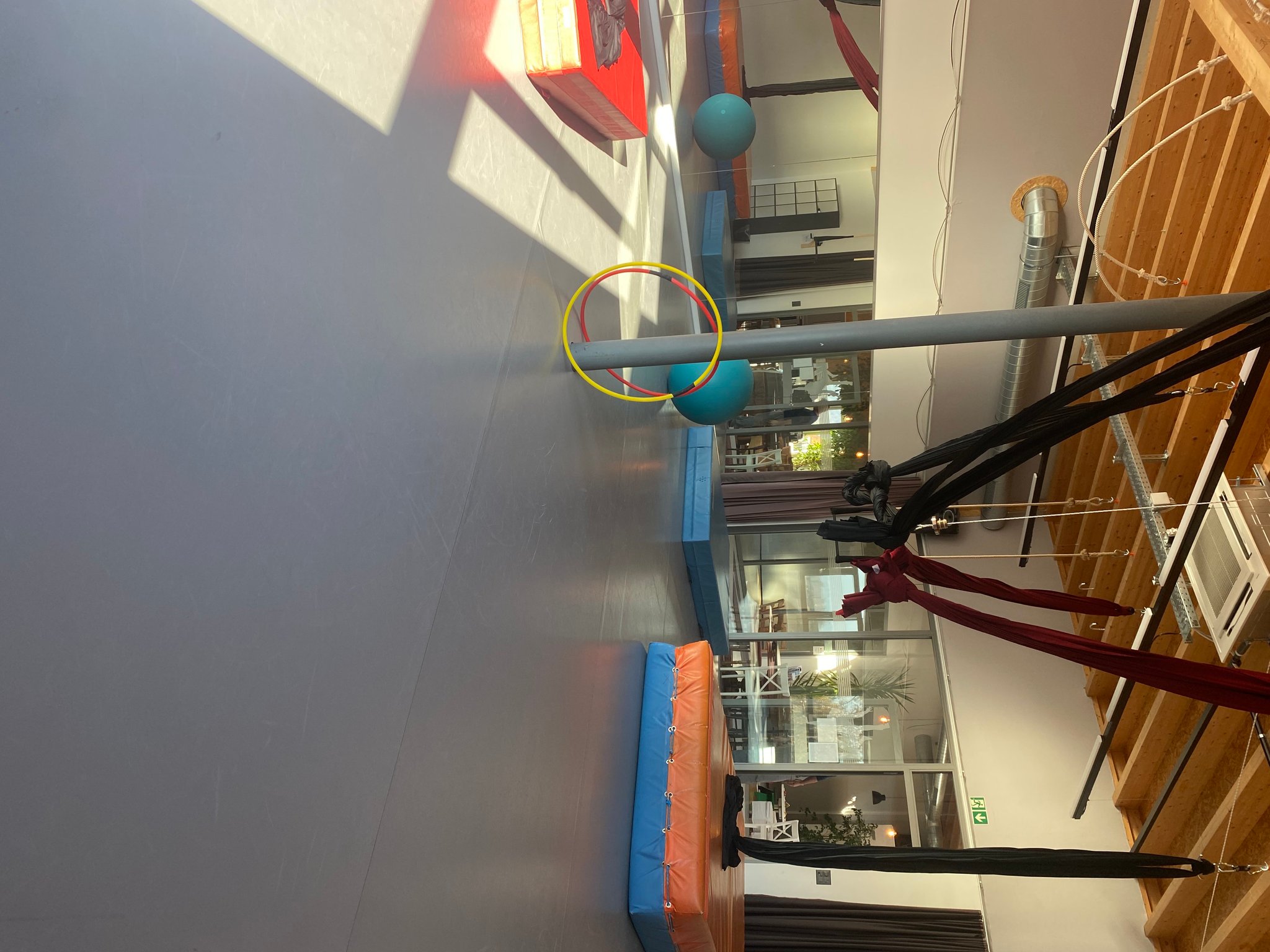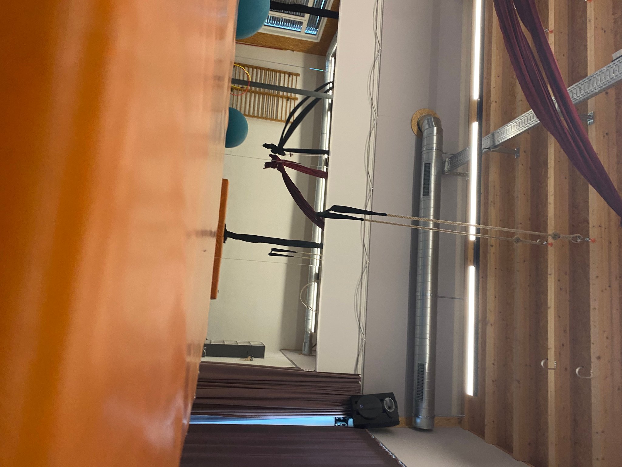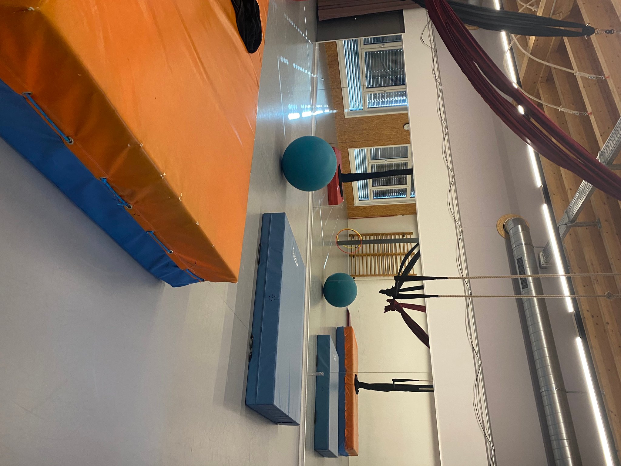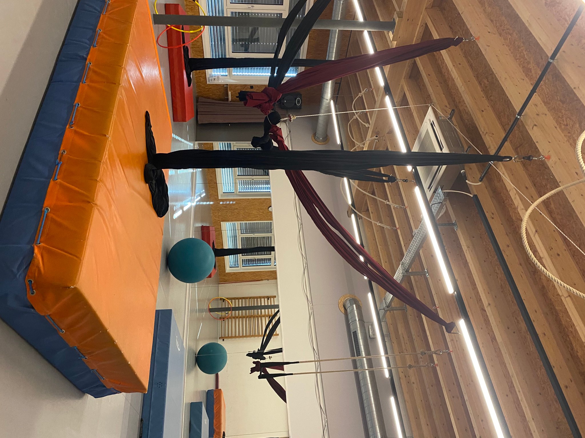 An der Decke dieses Raumes, befinden sich Trapez und Vertikaltücher. An der Wand hängt eine Sprossenwand. An der hinteren Wand befindet sich auch eine Grosse Matte. Sie lässt sich perfekt für Akrobatik gebrauchen. In diesem Raum finden viele Akrobatikstunden statt. Da der Raum sehr hoch ist, ist er sehr gut für Vertikaltücher und Trapez zu verwenden. Vorne an der Wand ist ein grosser Spiegel, damit sich die Kinder und Erwachsenen sich selbst auch zuschauen können. An der hinteren Wand befindet sich auch ein Schrank, damit die Kinder oder Erwachsenen ihre Sachen dort ablegen können. Es gibt natürlich auch eine gute Musikbox, damit auch alle im Raum die Musik gut hören können. Im Raum befinden sich auch grosse Fenster, dadurch ist der Raum sehr gut erhellt und gebraucht fast kein künstliches Licht. Es gibt natürlich eine gute Klimaanlage, sodass es im Raum nicht zu heiss wird. Im Raum befinden sich auch noch kleine und eher dünnere Matten.